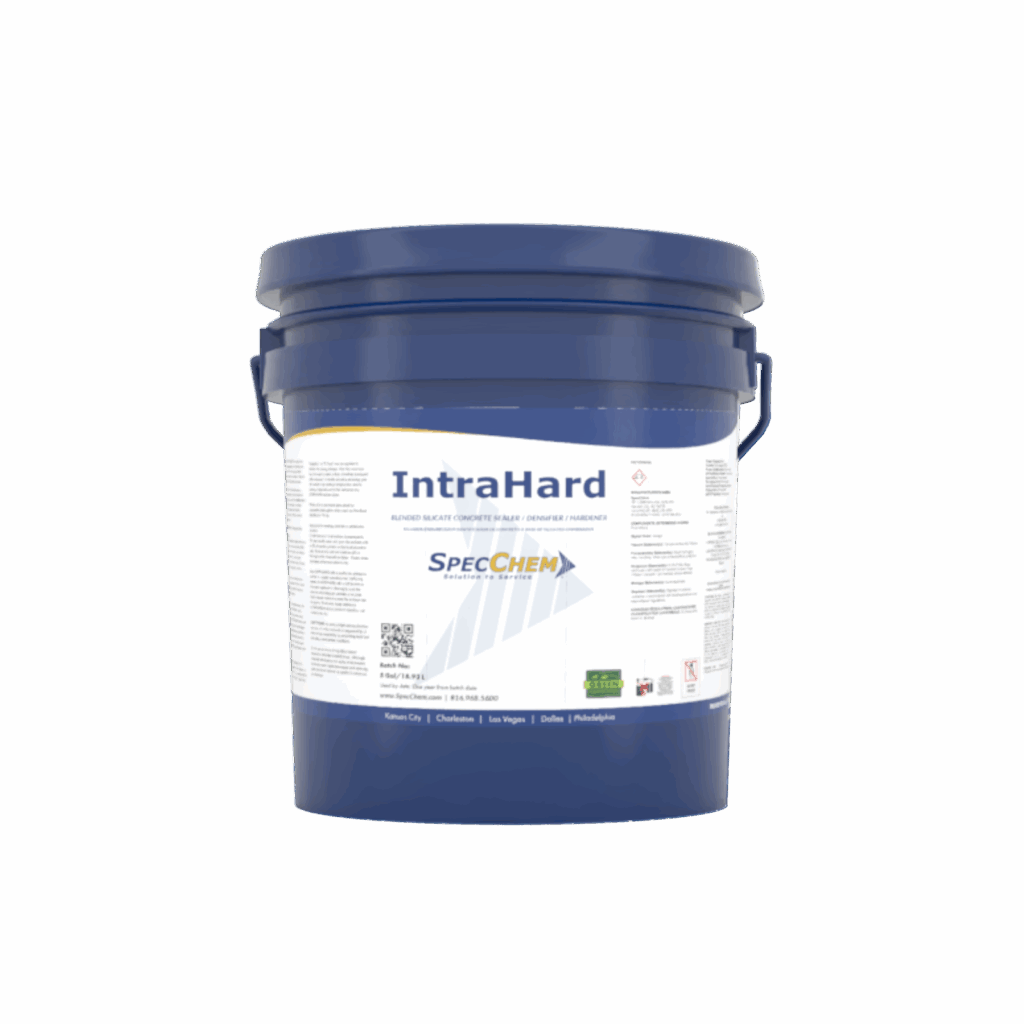 Always follow the Technical Data Sheet instructions and Safety Data Sheet (SDS) safety information. INTRAHARD may be applied to concrete that will be polished or burnished. Always apply INTRAHARD to a clean surface free of cures, bond breakers, oil, dirt, grease, or debris. When necessary, clean concrete surfaces with SpecChem Orange Peel or Berry Clean and neutralize with a neutral pH detergent. Thoroughly flush with water.