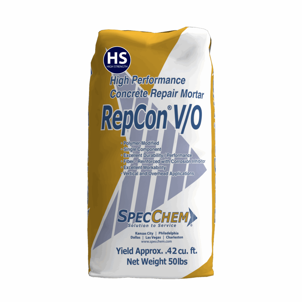 RepCon® V/O-HS is a single-component, polymer- modified, fiber reinforced concrete repair mortar with integral corrosion inhibitor for use in a variety of horizontal, vertical and overhead repair applications.
