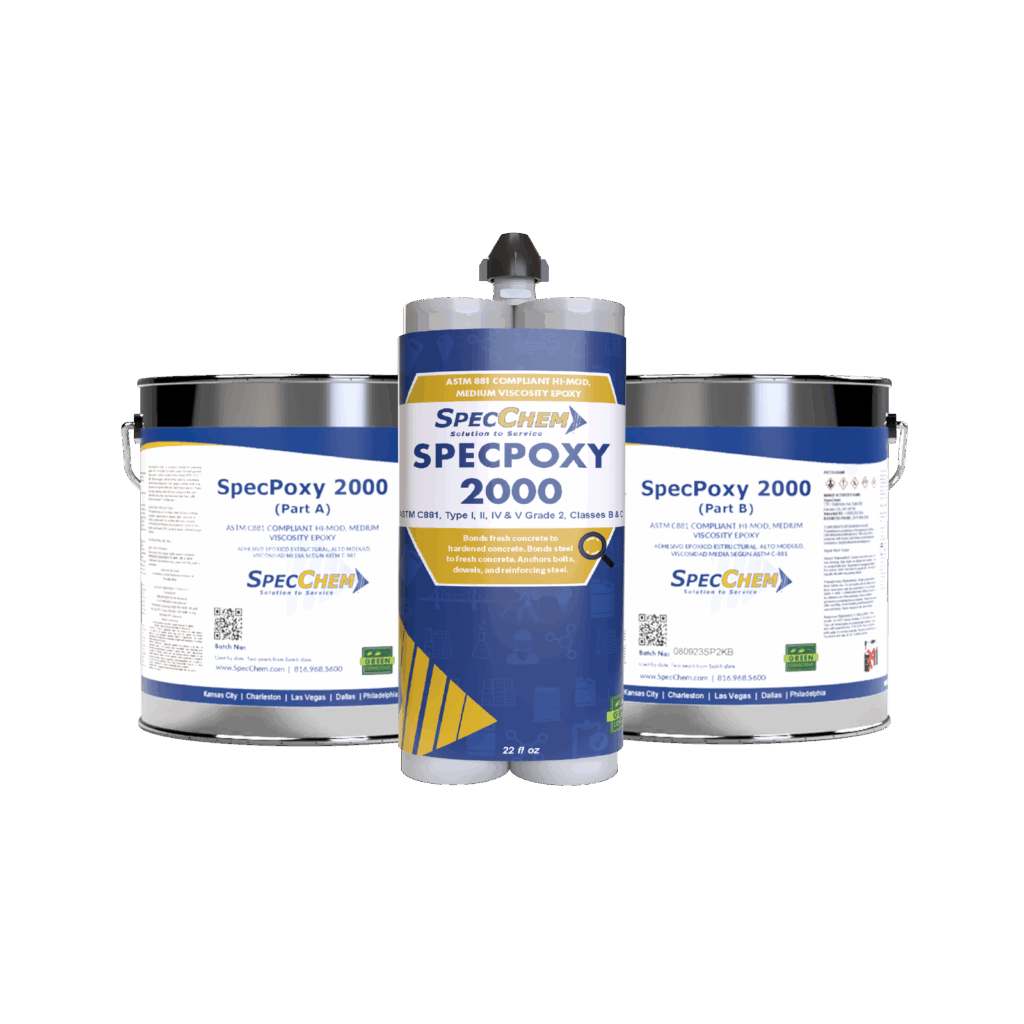 SpecPoxy 2000 is a two-component, multi-purpose, high-modulus, moisture-tolerant epoxy bonding adhesive that meets ASTM C881 requirements for Types I, II, IV & V, grade 2, classes B&C. This medium-viscosity, 100% solids, solvent-free adhesive is designed for a range of uses including bonding fresh concrete to hardened concrete, anchoring bolts, dowels, and reinforcing steel, and gravity filling cracks in concrete.